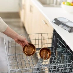 - Copper-colored stainless steel bowls come out of the decorative base for easy cleaning.